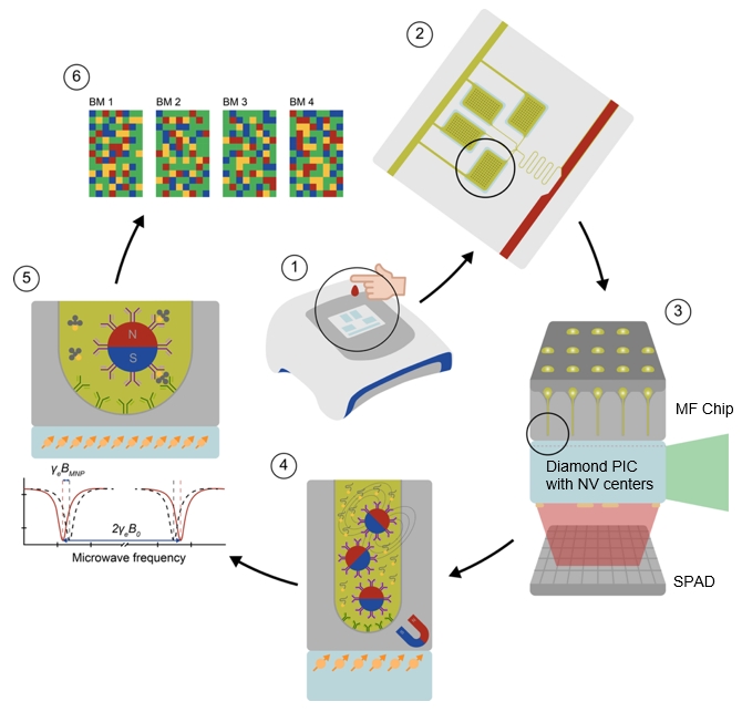 - The Standoff Budget: The cartridge mechanics (gaskets, passivation layers) must not push the fluid too far from the sensor. NV-center magnetic sensors require the target MNPs to be extremely close to the NV layer for detection. Therefore, the microfluidic channel must be engineered to ensure that nanoparticles can diffuse or be transported to within tens of nanometers of the diamond surface (the active NV sensing layer), rather than merely flowing past at a distance.